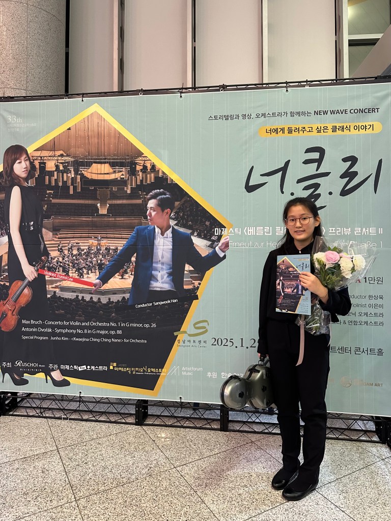 From August to January, we had hours of practices for this performance. It meant a lot especially to me because it was a preview concert for our Berlin concert in February. We were playing Dvorak Symphony 8 in G Major O. 88 and Bruch Violin Concerto No. 1 with the violinist, Eunmi Lee.