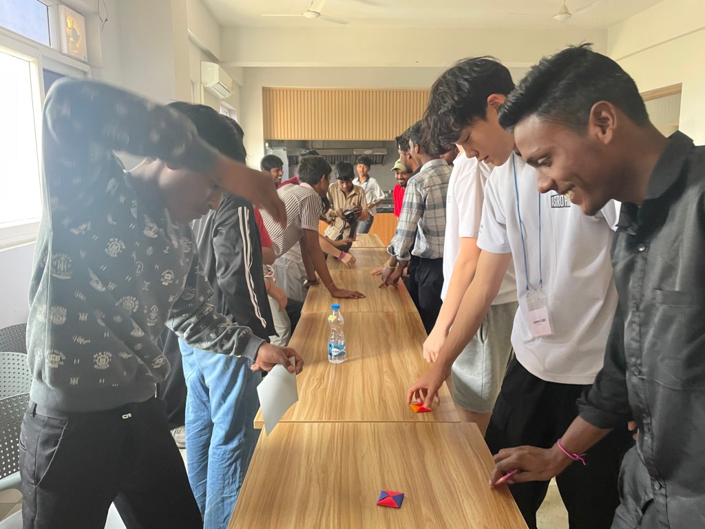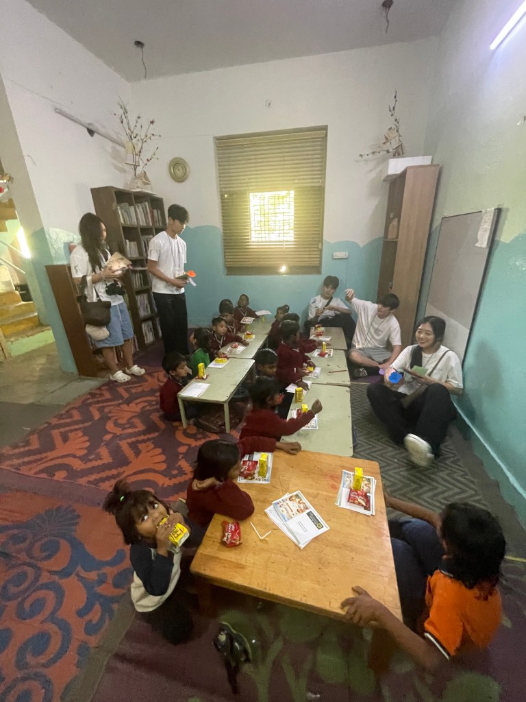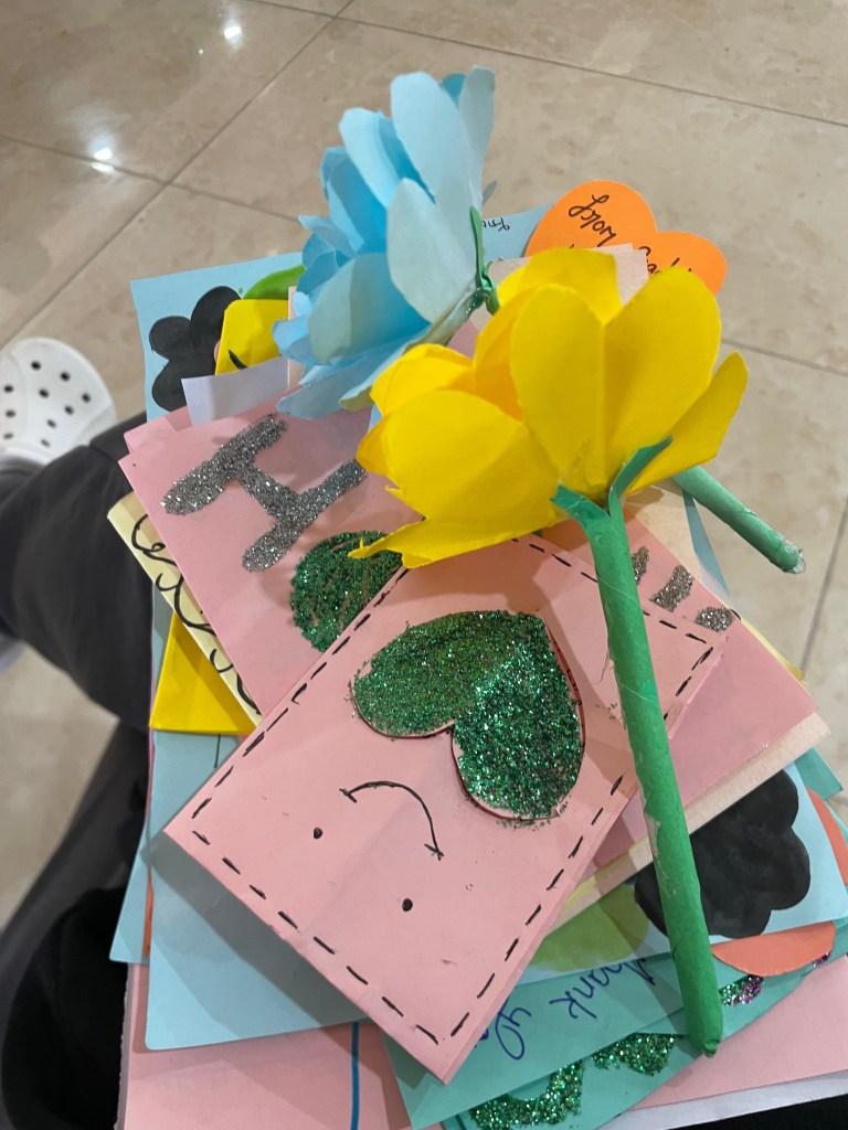 I couldn’t believe time had gone by this quickly. It was already the last day. We were supposed to go to the elementary and nursery kids, but the missionaries thought that it would be best if we went to the middle and high schoolers. I think it’s because of the strong emotional connection we made yesterday. We first went to the elementary kids, and while doing their class, we went in to hand out letters that were written by APIS students to the kids. We also handed out Choco Pie and juice boxes for everyone else. Then, they came out of their classroom to give us what they had written for us, including letters and paper flowers. I felt so special, especially because I didn’t expect anything from them. However, we had to say bye to all of the kids to go to the HESED school. Before we left, we all said bye to the students and the teachers. I couldn’t feel that this was my last time, so there was a small tear in my eyes, but it didn’t drop.