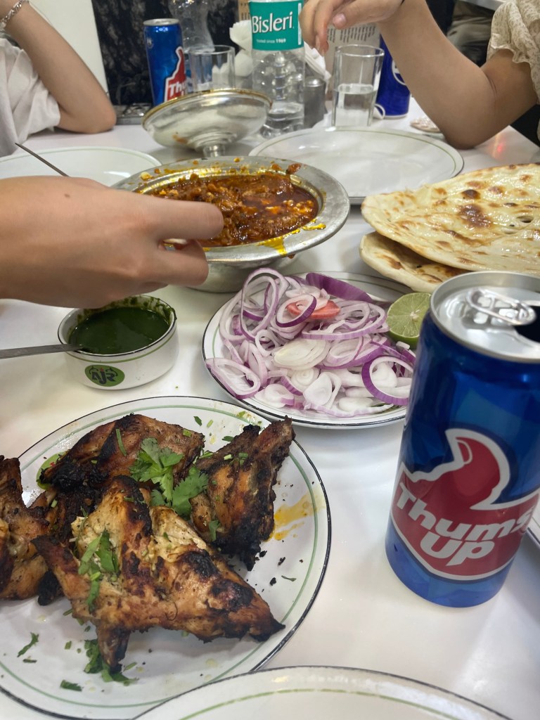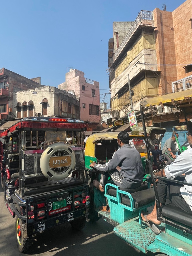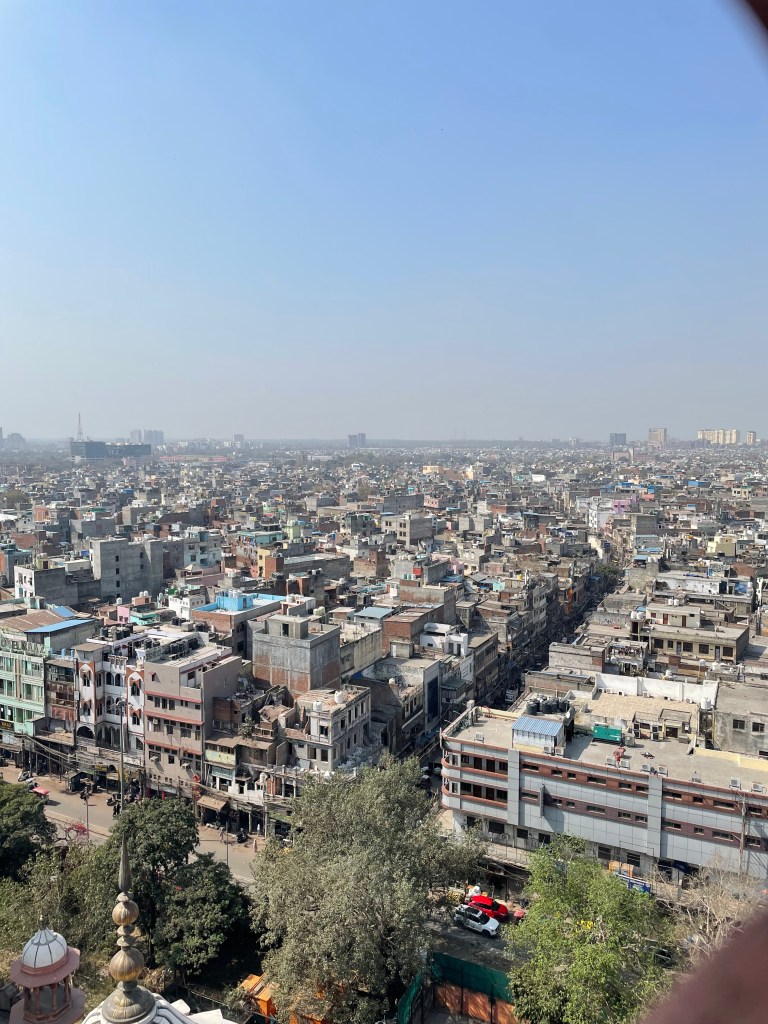 Today was finally the tour day. I was so excited to go to the city, but maybe I had a high expectation of the food and souvenirs in the streets. We took around 1 hour to get to Old Delhi, and our first stop was Jama Masjid, a huge Muslim mosque. The traffic was so busy in the roads, so we had to walk through the tour buses and tuk tuks (taxis). When we arrived at the mosque, we took our shoes off and put on a gown. It was really beautiful and grandiose, and we paid to go up to the tower. However, the way up was harsh, with the asphalt ground being spikey, and the tower being so narrow, but the view was absolutely breathtaking. It showed the whole city view, and I could see different temples and mosques from afar. After that, we cruised around the area, going to the traditional market streets. Because of their religious traditions, there was a lot of strong incense and crowded streets. The air was bad with dust going around. From that experience, I instantly realized how quiet Korea is compared to that street.