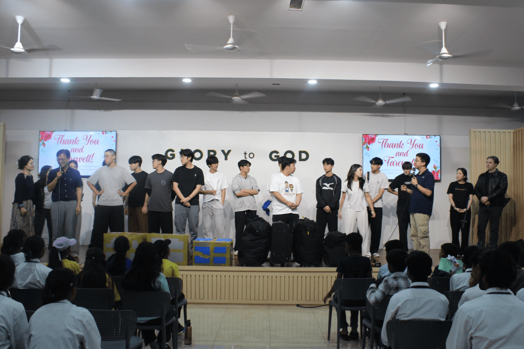 I woke up early to pack my bags and to eat my last meal at the hotel. Then, we went straight to the school for service, and I could tell that a few elementary schoolers came to the service. During the service, we did worship dances and sang worship songs. I looked around the room to see how the students were reacting to the worship. But only three caught in my eyes: the girls who were worshiping on stage. One of them was wiping their tears, and others were raising their hands high. This was the second time that I could feel that God was working in this place. Even in this harsh condition and environment, they still praised God. After the worship, we had goodbyes together. We went up on stage and stood in a straight horizontal line. After the president said a word of gratitude to them, the lights went down. The kids all came up and gave us letters, and they gathered in front of us for a short prayer time. During that time, I prayed for them, putting my arm around them. I had my tears in my eyes, but they didn’t fall. I think it’s because I’ve gotten used to serving in the school and felt like it was a home. After I prayed, I still wrapped my arms around them, holding them while they were still praying. I could hear some words, but it wasn’t like the prayers that we share with God; it was like crying out to God, but without the words, and with passion and love in their hearts. I think that moment is the moment that I’ll cherish forever.